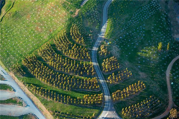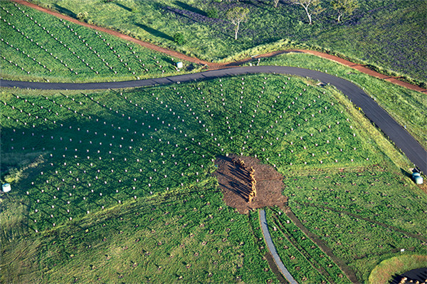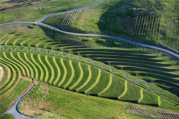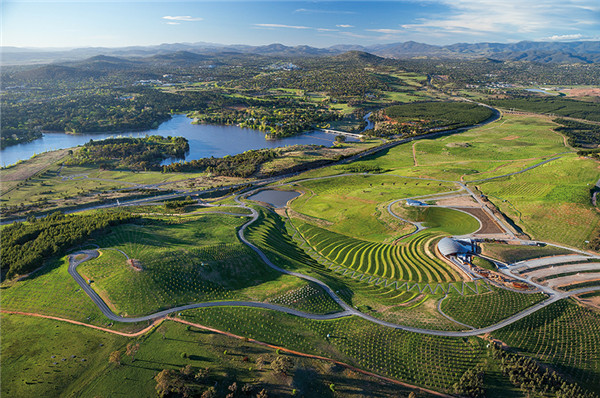 在2003年堪培拉叢林大火之后,政府為重塑該片區(qū),組織澳大利亞國(guó)家植物園國(guó)際設(shè)計(jì)競(jìng)賽。“森林100(100 Forests)”以其獨(dú)特的設(shè)計(jì)理念,即打造一個(gè)包括世界上最瀕危的100個(gè)樹(shù)木種類(lèi)的森林,贏得了此次競(jìng)賽。梯田式的大地景觀形成了主要的進(jìn)入植物園的游覽序列。基礎(chǔ)部分有一套精心設(shè)計(jì)的灌溉系統(tǒng),將水流引向大壩,再由大壩將用水重新分配到植物園。
