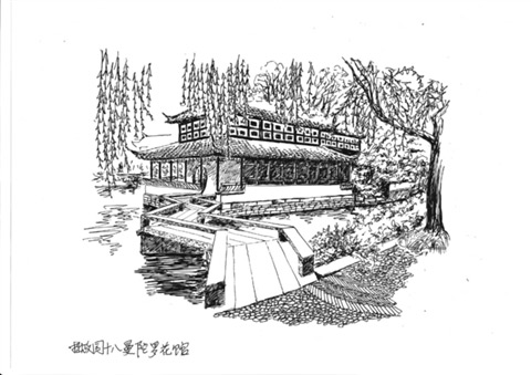 倒影樓(拜文揖沈之齋):位于拙政園西花園東北隅,臨水而建,樓高二層,上下各名,坐北朝南,面闊三間,三面繞回廊。樓上倚窗可居高臨下觀水中倒影,站在樓東側水廊上又可看樓影倒映水中,故名。舊時在此可眺望園外油菜花田,故曾稱“菜花樓”。倒影樓與“宜兩亭”遙遙相對,互為對景。樓下稱“拜文揖沈之齋”,齋內東西兩壁上嵌有明代文徵明、沈周半身像和傳記,以及文徵明撰書的《王氏拙政園記》和張履謙《補園記》等書條石,為紀念兩位著名文人,故名。