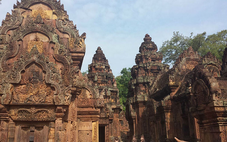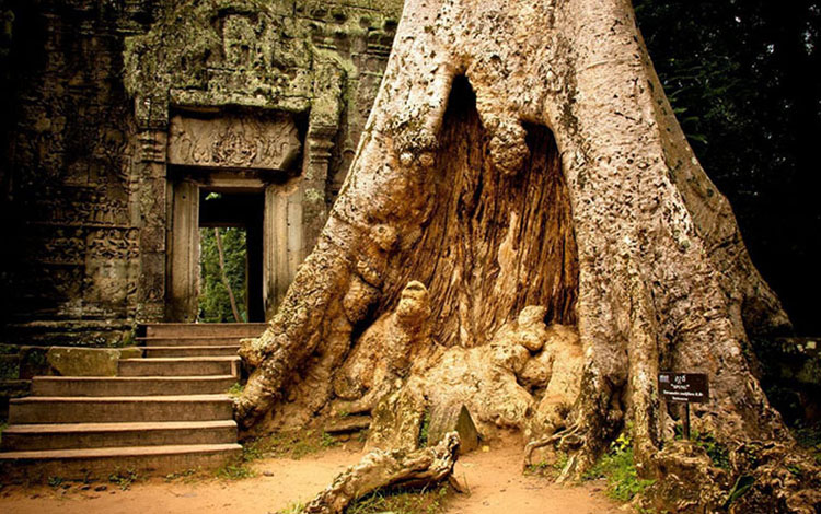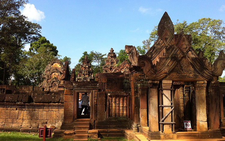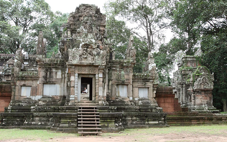 門南的一尊飛天女神浮雕,是寺廟內獨一無二露齒微笑的飛天女神。由圍墻包圍的寺廟大廣場,占地面積82公頃。除去位居中央的寺廟,這一片廣場是古代城市和王宮的遺址,王宮遺址在寺北。如今古城和古王宮都蕩然無存,滿地被森林覆蓋,只遺留下一些街道的輪廓。