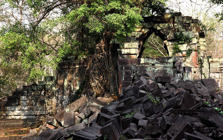 吳哥窟中常用的另一種建材是紅土石。紅土石是巖石經過熱帶炎熱氣候長時間風化,以致巖石中的可溶性礦物質流失,殘留不溶于水的氧化鐵和石英等礦物質而形成的多孔紅棕色巖石。中南半島的地表含豐富的紅土石,容易從地層中開采。開采出來的紅土石可切割成磚狀,置空氣中逐漸硬化。在吳哥窟中,紅土石常用作臺基的護墻,或用于鋪地、造堤和圍墻。
