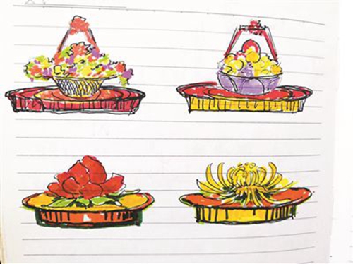 最上面一本,是藍海浪在1999年使用的。隨便翻開幾頁,可以看到許多手繪彩色設計圖——先用鉛筆或水筆勾勒出輪廓,再用彩色筆填充色塊;有時候為了表現出花團錦簇的視覺效果,還要用紅色、粉色、黃色、綠色等彩色筆勾畫細節……“那時候,計算機輔助作圖工具還沒有普及,設計圖以手繪為主,80%以上的設計工作都在本子上完成。”藍海浪說,無論走到哪里,他都會背著雙肩包,筆和本始終隨身攜帶。