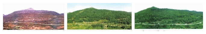 垣縣雅酉鎮(zhèn)同一個(gè)山頭,在實(shí)施退耕還林前后的鮮明對(duì)比,從左至右依次攝于2001年、2007年、2012年。