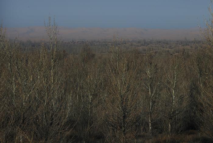 “真是天翻地覆吶。”2018年12月14日,時值寒冬,大片的楊樹哨兵一樣排在沙丘前,高二云摩挲著楊樹皮,不住地感慨。