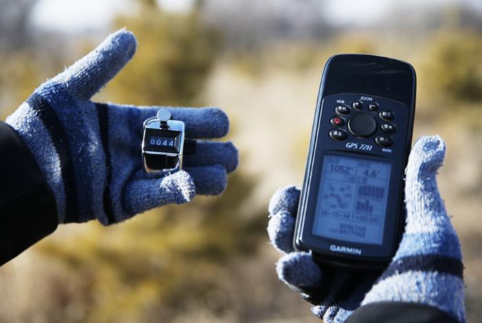 12月17日,工作人員正在用計數器(左)和GPS(右)驗收林地 新京報記者 尹亞飛 攝