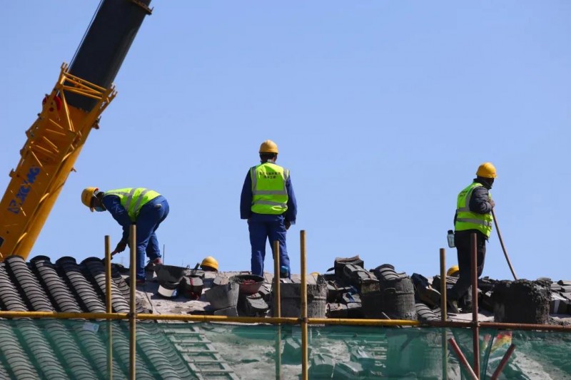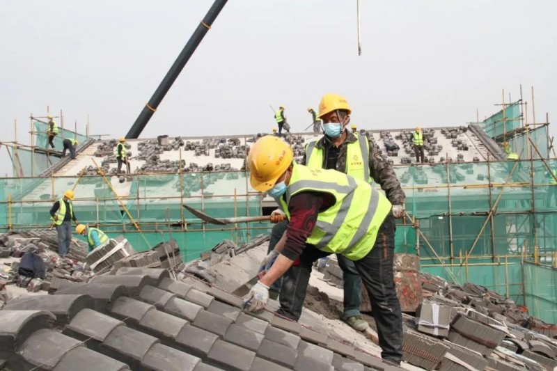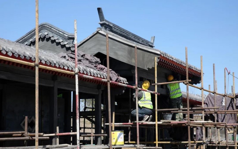 不遠處的古建筑上,城建園林古建公司非物質文化遺產傳承者李燕肇用靈動的畫筆描繪著古今。他說:“庭院建筑為仿明清小式做法古建筑風格,占地面積501.84平方米,淺棕色油漆,彩畫裝飾,整體樸素大方,由正門的敞軒、西側的四角亭和東側茶室組成,幾座單體建筑以垂花門,游廊相連接,作為古建匠師專家團隊成員之一,我與盧立輝、李海先組成專家團隊盡己所能為副中心建設錦上添花。”話音未落,另外一邊“添磚加瓦”的瓦匠們發出“叮叮當當”的聲音,他們正在對古建筑屋頂進行二次結構施工。這一個個疊落的小小瓦片,不僅可以防止雨水滲入室內,還具有保溫、隔熱的作用,可謂凝結了中國古建歷史的大大智慧。