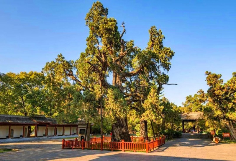 至今,黃帝當時的手植柏依然挺立在陜西軒轅廟中,這棵柏樹高20米以上,胸圍7.8米,雖經歷了5000余年的風霜,至今干壯體美、枝葉繁茂,樹冠覆蓋面積達178平方米,是世界上最古老的柏樹,人稱世界柏樹之父。