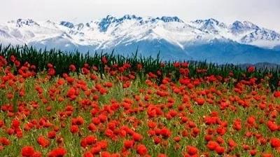 在塔城祫民縣的巴爾魯克山芍藥谷、布爾干河、吐爾加遼草原、庫魯斯特草原,粉紅的杏花、艷紅的芍藥花、金黃的錦雞兒花、橙黃的野生郁金香爭相開放,描繪出一幅生機勃勃的春天畫卷。