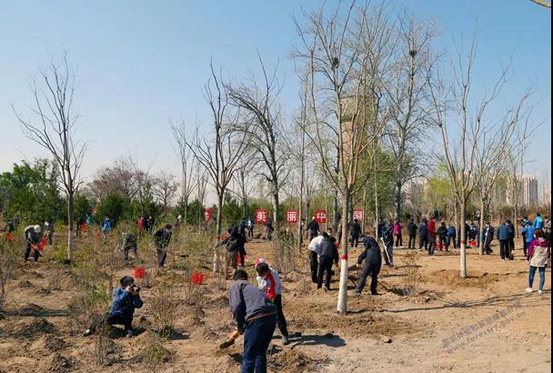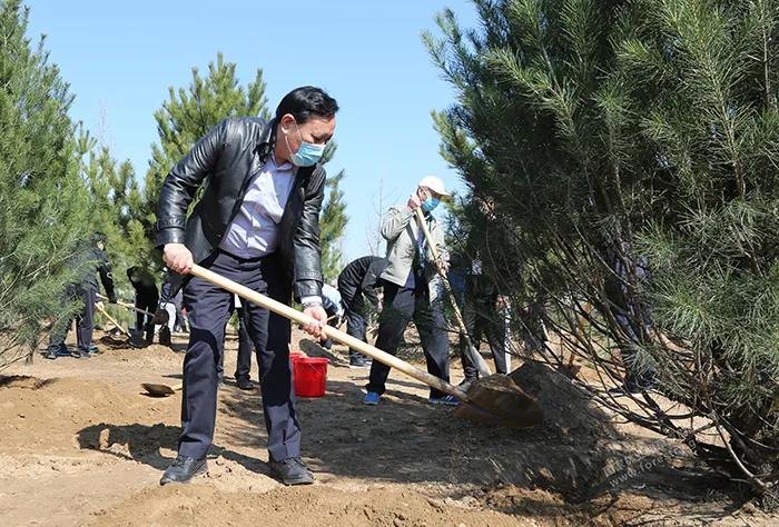 一大早,部長們佩戴口罩統一乘車到達植樹現場,測量體溫后直奔植樹地點,自取植樹用具,以1米間隔分散植樹。扶正樹苗、回填泥土、圍堰澆水……經過一上午的勞動,共栽下油松、法桐、銀杏、國槐、八棱海棠等樹木2050株。