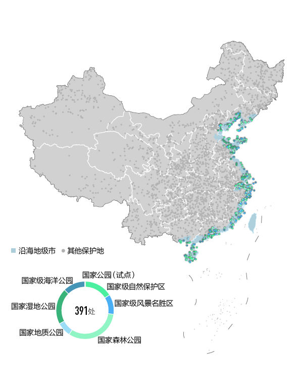 中國的海岸線蜿蜒曲折,陸地海岸線長達1.8 萬千米。在水陸交界的地方,或因為陸地河流沖擊形成沙岸,或由于海浪拍擊巖石形成巖岸,又或有著紅樹林、珊瑚等生物的頑強生長形成生物海岸。這條海岸線上一共分布著391 處國家級自然保護地。令人意外的是,海洋公園、濕地公園、地質公園這些跟水陸關聯較強的類別沒有在數量上占絕對優勢,反而是森林公園的數量最多。▲福建漳江口紅樹林國家級自然保護區