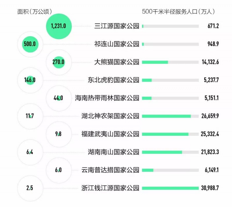 以目前處于試點建設期的十個國家公園為例,參照當下交通工具的速度,300 千米相當于1 小時高鐵的路程,500 千米相當于1 小時飛機的航程,如果以汽車、飛機為交通工具進行評估,結合中國的人口密度分布數據,我們可以估算出每個國家公園一小時可達圈內可能服務的人口數量。