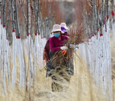 在青海省玉樹藏族自治州高原千畝林木良種繁育實驗基地,當地群眾在清理修剪過的樹枝(3月29日攝) 新華社記者 張龍攝