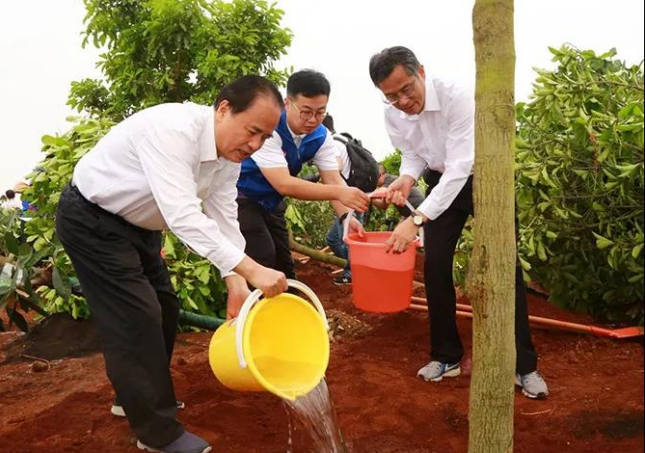 劉賜貴接連種下銀葉、黃槿、紅花玉蕊等海南鄉(xiāng)土喬木。大家一起揮鍬挖坑、扶正樹苗、填土夯苗、拎桶澆水,共種下了700多棵各類樹木,現(xiàn)場一派熱火朝天的勞動景象。