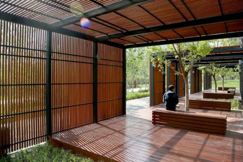 這片占地近530畝的森林公園,處處體現著高質量發展理念。油松、柳樹等鄉土喬木打下綠色基底,原址上的大樹也得到保留。旱溪和水系連接貫通,在形成特色濕地景觀的同時,為野生動動物營造了棲息地。林下,鄉土地被覆蓋了裸露的土地,樹坑里的枯枝落葉既透水又保濕。再生骨料遍布在公園起伏的地形中,實現資源再利用。