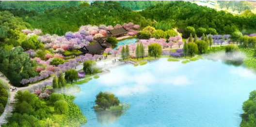 剛一亮相,櫻花庭院的美景就在微信朋友圈中刷了屏。明清風格的仿古建筑與周遭栽植的粉色、白色櫻花相映襯;門前,人工挖鑿的蓄水池已經匯聚起一汪碧水,透著江南水鄉的婉約和靈秀。