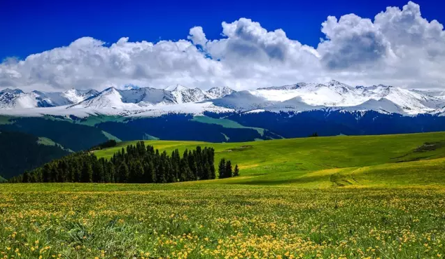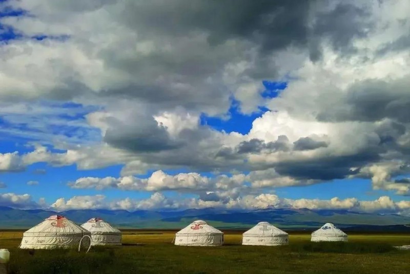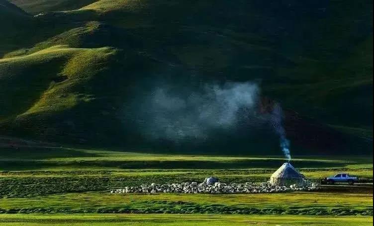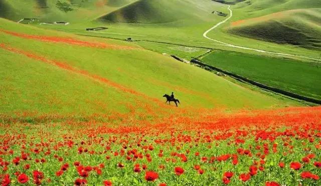 路邊的小河流水潺潺 山花爛漫的山坡上 到處都點綴著造型別致、獨具風格的氈房 …… 新疆的大草原呈現出最美的姿態
