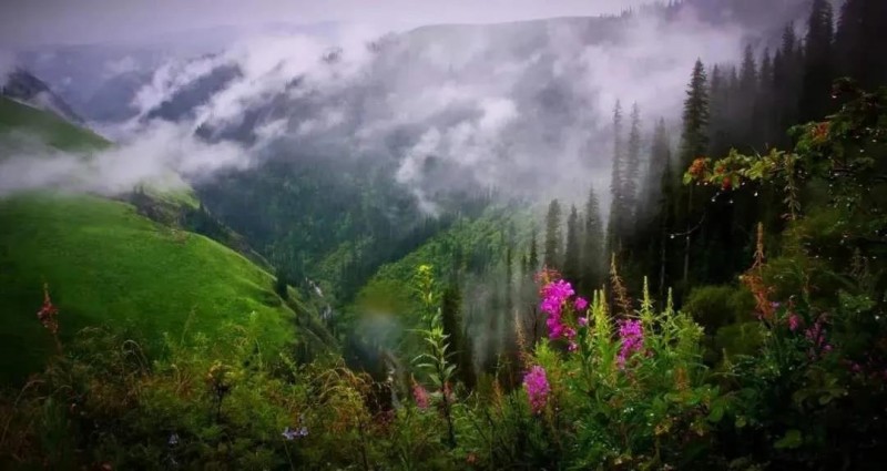 喀拉峻草原位于新疆伊犁哈薩克自治州特克斯縣西天山向伊犁河谷的過渡地帶,四周終年不化的雪山,環繞著一片海拔2000多米的空中草甸,喀拉峻草原上一溝溝、一片片蒼翠高拔的原始云杉交織在百花草原之間,晨曦落霞、雨后云霧,讓您感受到“江山分外妖嬈”。