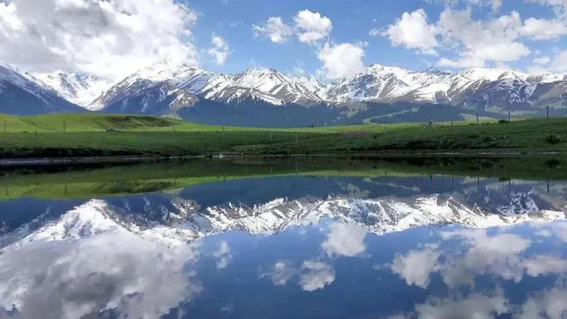 這里藍天、白云、綠草茵茵、流泉滾滾、溪水淙淙,云衫密林、蒼翠挺拔,冰峰雪嶺倒影水中,真是一步一景,如詩如畫,美不勝收。