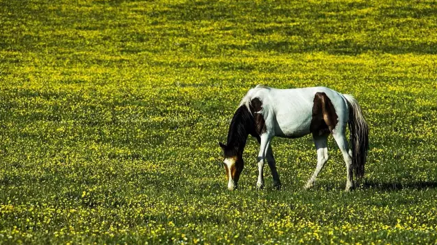 墨綠的松樹屹立在山脊 翠綠的小草鋪滿大地 白云圍繞著山腰 駿馬三五成群地集聚在一起 悠閑地吃著草