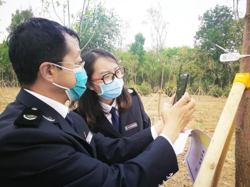 檢疫人員檢查苗木出圃時的電子“身份證”綁定情況