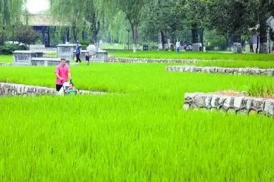 早在2010年,北塢公園率先完工,它恢復(fù)了稻田,在公園里有了農(nóng)田般開闊的空間,而不是種樹追求林蔭。金山寺、戲臺、拆遷村里原有的大柳樹也被保留,讓拆遷上樓的居民回到這里時時刻刻都能憶起鄉(xiāng)愁。公園里的湖也是純天然的,沒有鋪設(shè)防滲膜,水位線隨著自然水位線的漲落而漲落。
