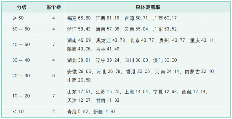 各省(自治區、直轄市簡稱“省”,下同)森林覆蓋率超過 60%的有福建、江西、臺灣、 廣西 4 省,50%~60%的有浙江、海南、云南、廣東4省,30% ~ 50% 的有湖南等11 個省,10%~30%的有安徽等13個省,不足 10% 的有青海、新疆2省。