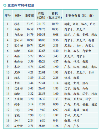 喬木是構成森林植被的主體,其作用和地位通常采用喬木樹種重要值來反映。某一樹種在森林植被中的數量越多、分布越廣、個體越大,該樹種的重要值就越高。全國喬木樹種按重要值排名,位居前20的樹種分別為杉木、白樺、馬尾松、落葉松、蒙古櫟、楊樹、山楊、云南松、木荷、黑樺、柏木、青岡、遼東櫟、油松、五角楓、楓香、云杉、紫椴、冷杉、尾葉桉,其林木株數合計973.51億株、占全國喬木林株數的51.44%,蓄積合計90.46 億立方米、占全國喬木林蓄積的53.03%。