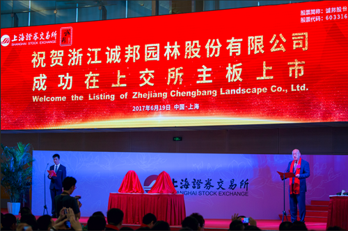 2017年6月19日,浙江誠邦園林股份有限公司成功登陸上海證券交易所主板(股票簡稱:誠邦股份,股票代碼:603316),成為A股市場今年第232家上市公司。首次發行股數5082萬股,每股發行價格為6.82元,發行市盈率22.98倍,擬募集資金總額34659.24萬元。