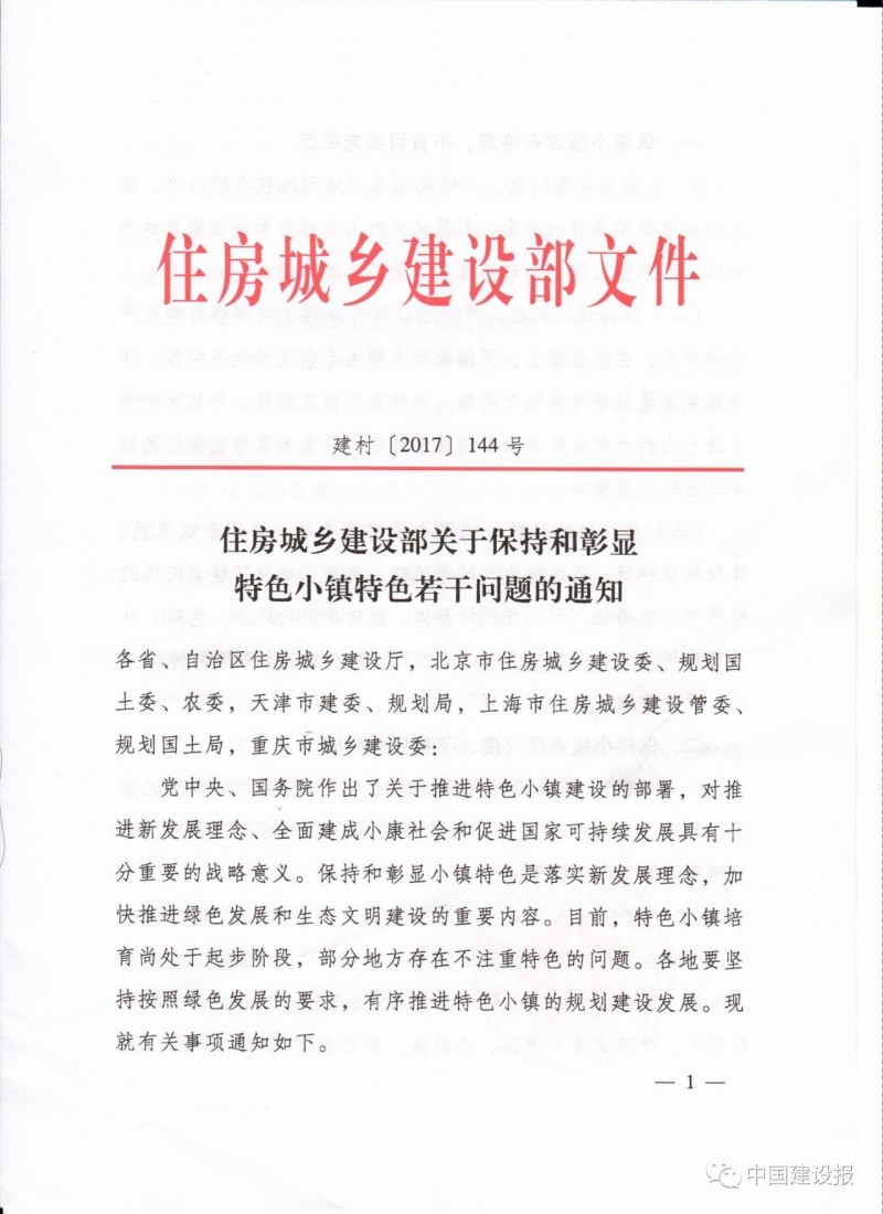 住建部日前印發(fā)《住房城鄉(xiāng)建設(shè)部關(guān)于保持和彰顯特色小鎮(zhèn)特色若干問題的通知》(建村﹝2017﹞144號),明確: