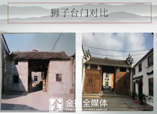 例如,獅子臺門是李宅的大門,建于明宣德年間,原先,獅子臺門外立面是水泥,看上去與普通的民房沒什么不同;改造后,外立面成了木質的,安上了仿古門窗,并增設了馬頭墻等,以其原有的蒼老姿態向外界展示自己。