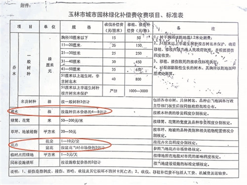 工作人員解釋,在2004年的時候,玉林市物價局發布了一份《關于玉林市城市園林綠化補償費收費問題的批復》的文件,里面指出,凡在玉林市規劃范圍內,損傷園林植物的,均要按照規定的收費項目和標準繳納園林綠化補償費。