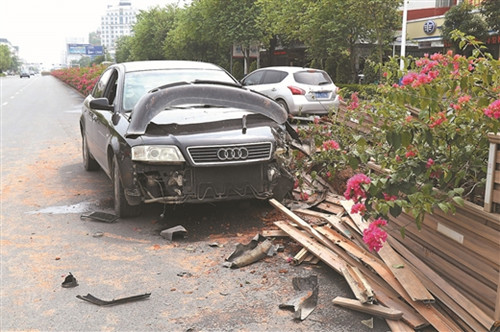 8月1日上午10時25分,一輛奧迪轎車行駛在玉林教育東路上,突然失控撞上了道路中間的箱式隔離綠化帶。事發后,轎車停在隔離欄旁,幾個箱式隔離綠化帶被撞破碎,花土撒了一地。