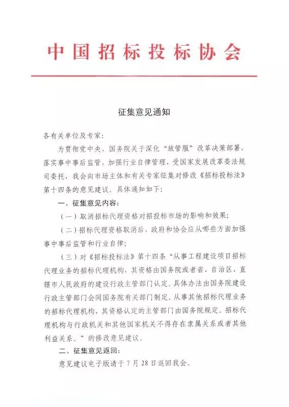 7月31日,受國家發(fā)改委法規(guī)司委托,中國招標投標協(xié)會將組織市場主體、業(yè)內(nèi)專家學者,就《招標投標法》第十四條關(guān)于工程招標代理機構(gòu)資質(zhì)管理的條款修訂收集意見。