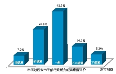 此次調查還發現,受訪者對職能部門工作人員“行政能力”的滿意度分值僅為62.3分,在所列選項中位居倒數第四。其中,有35.0%的受訪者對西安市干部的行政能力表示“很滿意”或“比較滿意”;表示“不太滿意”或“不滿意”的占22.8%;另有高達42.3%的人持“一般”模糊態度。