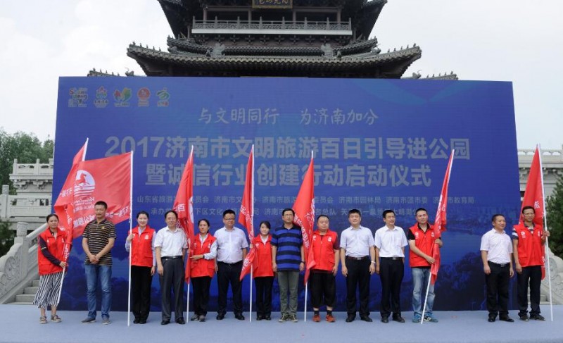 8月12日上午,2017濟南市文明旅游百日引導進公園行動啟動儀式在天下第一泉景區大明湖公園超然樓廣場舉行。活動由山東省旅游發展委員會、濟南市文明辦、濟南市旅游發展委員會、濟南市園林局、濟南市團市委、濟南市教育局、主辦,歷下區文化(旅游)局、濟南市旅游志愿者總隊、天下第一泉大明湖景區共同承辦。濟南市旅游發展委員會閆險峰副主任、濟南團市委徐龍義副書記、濟南市教育局王誠副局長、濟南市園林局王永華副巡視員、濟南市文明辦范華陽處長、歷下區旅游局田照河局長,以及來自各大公園、旅行社、酒店、學校、商業街區、旅游啄木鳥、老朋友雜志等單位的旅游志愿者代表和新聞媒體等500余人共同出席活動。