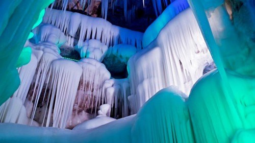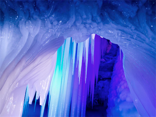 山西省忻州市寧武縣萬年冰洞內,晶瑩剔透的冰筍、冰柱、冰瀑、冰葡萄、冰鐘乳分布于各層空間,在五彩燈光的照射下呈現出夢幻般的景象。