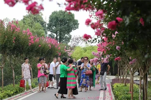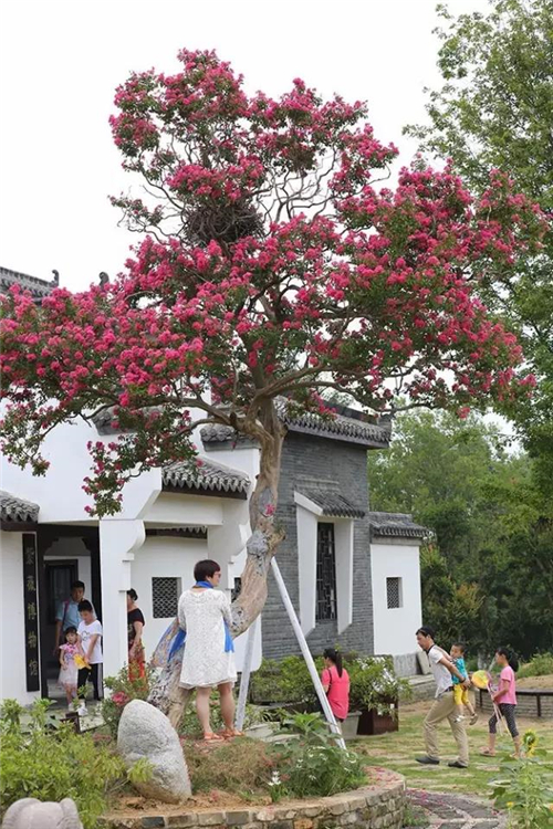 武漢紫薇都市田園占地2000余畝,種植有精品紫薇、丹桂、荷花、海棠等過100萬株。特別是1萬余株高桿紫薇中,樹齡過百年的就有2000余株,其中“鎮(zhèn)園之寶”——一棵唐代“紫薇皇后”樹齡逾千年,每到花季依然花滿枝頭,令人嘖嘖稱奇。遍布園區(qū)用紫薇編織的各種紫薇亭、紫薇長廊、12動物生肖等扎景達200多處,堪稱華中一絕。