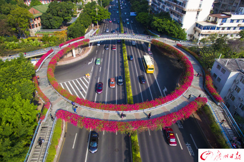 2017春節(jié)期間,廣州市中心區(qū)10多座人行天橋立交橋上的簕杜鵑齊開放,與各色年花斗麗爭妍,這是自2003年天橋綠化建設(shè)以來,簕杜鵑首次在1月開花。種植水紅簕杜鵑的東風(fēng)路陵園東西兩側(cè)人行天橋、執(zhí)信南人行天橋、華泰賓館人行天橋、盤福路立交橋;種植檸檬黃簕杜鵑的湖天賓館人行天橋;種植紫花簕杜鵑的新滘西路果樹公園人行天橋、逸景路人行天橋、上沖南人行天橋、南洲北路人行天橋、陳李濟(jì)人行天橋、金穗路口人行天橋;配植櫻花簕杜鵑+紅花簕杜鵑的云臺花園人行天橋,都已經(jīng)成為廣州的新“名橋”。