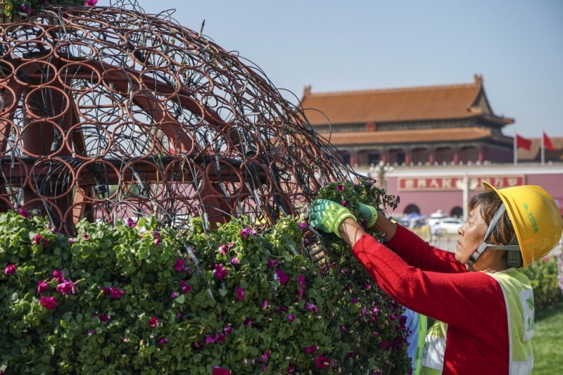 9月18日,工作人員在天安門廣場布置花卉。當日,天安門廣場國慶花卉布置工作開始。據介紹,國慶期間天安門廣場中心將布置“祝福祖國”巨型花籃,東西長安街將各擺放7組花壇。殷剛/攝
