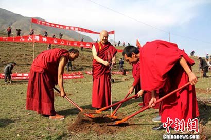 民和縣政協副主席、杏兒鄉才旦寺民管會主任才旦堪布也帶領僧眾參加義務植樹,并與杏兒藏族鄉各界代表一同植樹。