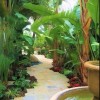 庭院植物主要用高大的棕櫚樹搭配低矮的灌木叢,常見的植物有椰子樹、綠蘿、芭蕉樹、鐵樹、雞蛋花等等,這些植物的形態都很有熱帶風情