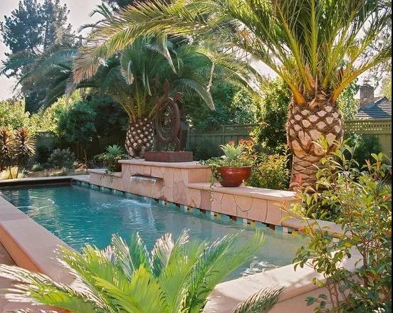 庭院植物主要用高大的棕櫚樹搭配低矮的灌木叢,常見的植物有椰子樹、綠蘿、芭蕉樹、鐵樹、雞蛋花等等,這些植物的形態都很有熱帶風情