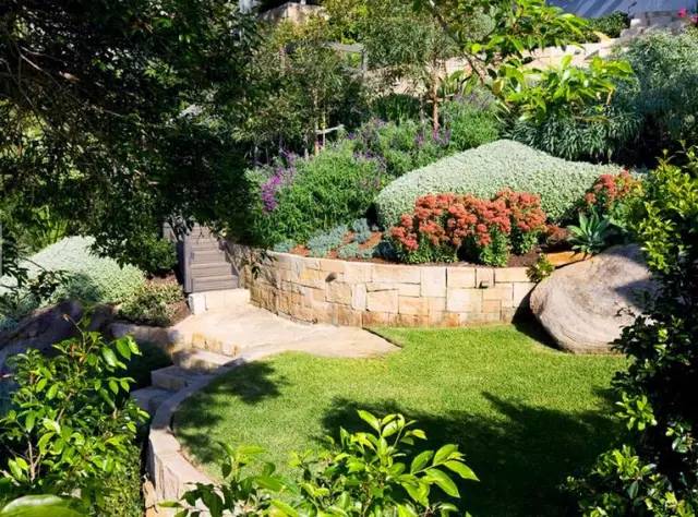 這個花園的設計是一個頗具挑戰性的項目,1600平方米的景觀在一個45度的斜坡上,土地和水的使用都受到了限制。一系列的石質臺階和小徑沿著分層景觀臺一路延伸向岸邊。沿途植物頗為亮眼,一個混合了當地觀賞性灌木和一些經典海灘植物的迷你花園與自然景觀相呼應。