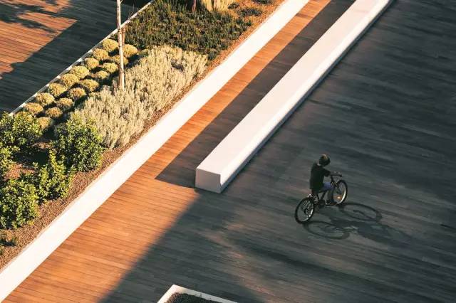 項目是關于住宅綜合體一層露臺和三層屋頂花園的景觀設計,為私家院落。設計師將二層的屋頂花園設計為自我維護的花園系統,激發其與周圍環境的融合,促進公共空間的形成。整個綜合體的布局充滿線性和幾何特征。一層露臺,幾棟建筑物圍合出一個中央空間。中央空間以石板鋪裝,強調其與建筑物的聯系,突顯入口空間,同時還設計了一個休閑空間,由抬升的種植池和水景小品組成。水景小品以拋光的混凝土墻為中心,富于水體流動的光影效果。這面幕墻起到部分保護中央露臺花園的作用。三層屋頂花園分割為兩個功能迥異、相互獨立卻又相連的空間:南部區域為一個日光浴場所,顯眼地設置了游泳池;北部區域為一個休閑花園,點綴著游樂場元素。設計的連續性源自對場地的透徹理解:概念和功能的流暢貫徹至整個公共空間和私人空間;步道路網、休閑功能得到了強化;同時還整合了綠色元素。