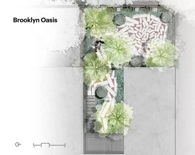 在布魯克林的一個(gè)密集的住宅區(qū)里,Michael Van Valkenburgh Associates事務(wù)所將一個(gè)小后院改造成一個(gè)讓人舒適、靜謐的花園。該公園在一個(gè)5層的排房后面,營造出較大型空間的幻覺以及在自然中漫步的情懷。該事務(wù)所重新激活了被遺棄的蓄水池,而且該公園的雨水收集是小城市空間雨水管理價(jià)值展現(xiàn)的模范案例。