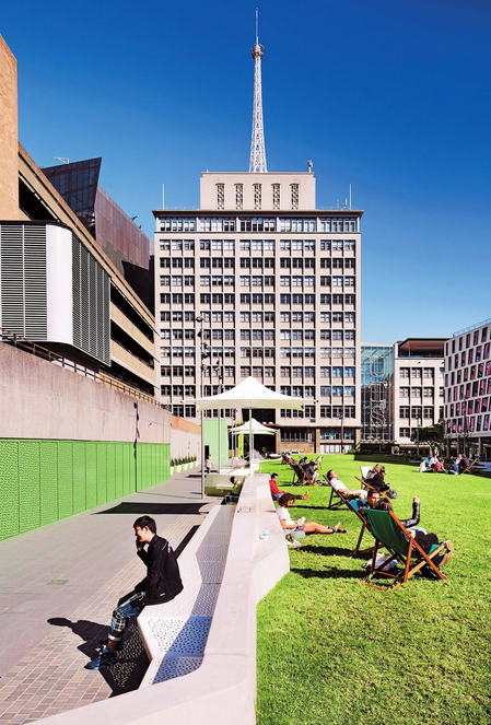 悉尼科技大學(xué)校園綠地是悉尼科技大學(xué)市中校區(qū)最為重要的公共開放空間。校園綠地的規(guī)劃是以具有強(qiáng)烈特色的概念設(shè)計(jì)分析為主導(dǎo),并體現(xiàn)在規(guī)劃和設(shè)計(jì)過程中所出現(xiàn)的每項(xiàng)設(shè)計(jì)改動(dòng)決策之中。為了呼應(yīng)當(dāng)年校園總體規(guī)劃的遠(yuǎn)景:打造出“吸引人停留的校園”,景觀設(shè)計(jì)工作室將場地劃分為三部分:中心綠地、中心廣場和愜意花園。每個(gè)部分的位置選址都經(jīng)過了精心的安排,全面考慮了場地朝向、光照、流線、場地功能用途及周邊建筑開發(fā)計(jì)劃情況。