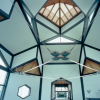 入口大廳采用了兩層通高的形式,最為突出的特點是其與眾不同的頂部處理。建筑師沒有簡單地使用傳統的雙坡頂形式,而是對傳統的屋面形式進行了解構,把它分解成最本源的幾何形:方和三角;然后再根據現代博物館的使用要求對這些原形進行重組。這樣的處理使入口大廳充滿了現代氣息,同時又給人一種似曾相識的感覺。在這些原形的使用中,三角形可謂貝聿銘先生的最愛,他以前的眾多重要作品中都有對三角形的精辟運用。但這次的使用似乎最具有人文含義,因為人們能從中品味出江南建筑坡屋頂一脈相傳的神韻。這種傳承的另一個體現是屋頂材料的處理:貝聿銘在蘇州博物館中沒有使用傳統的小青瓦,而選用了產自山西與內蒙交界地帶的“中國黑”花崗石材。石材被加工成菱形石片,從遠處看去既保留了青瓦的尺度和層次,又避免了傳統青瓦易碎且手工感過強的問題。