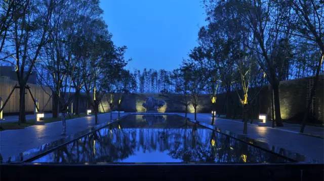 揚州萬科西湖九曲會所景觀是由張唐景觀事務所設計。揚州萬科西湖九曲會所景觀以入口庭院為主。黑色花崗巖倒影水池兩旁配植雙排小葉紫薇和白蠟,水池結束在灰色石墻為背景的黃山石。會所建筑與水池之間以木頭屏風隔斷,條形的礫石鋪裝上散立著暗喻中國古代文化的拴馬樁。