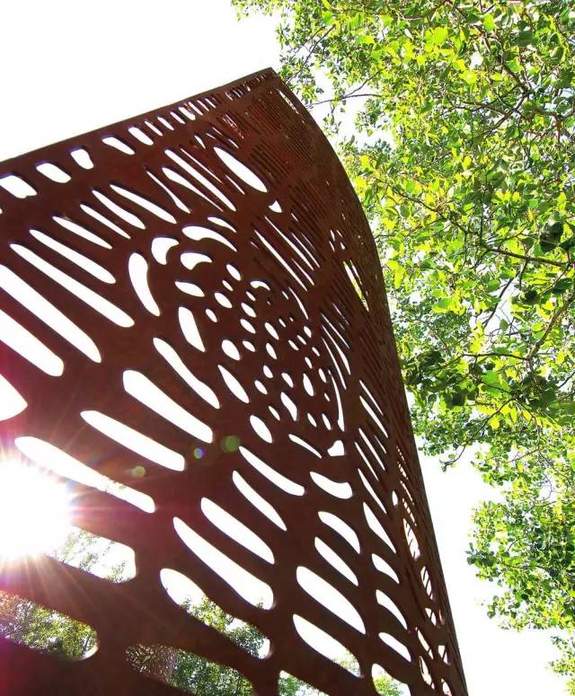 這個獨特的景觀項目設計的目的是呈現澳大利亞的本土景觀以及桉樹獨特、神秘的特質。桉樹沿金屬板栽種成帶狀布局。這種單一的模式表現的是桉樹的地方特色;復雜的葉子形狀說明他們都是沿短暫存在的水源生存的機會主義者;種類繁復的桉樹也有著豐富多種的色彩、紋理和形態。置于地面上形態各異的桉樹干葉起到了裝飾的作用,隱藏在內的桉樹油則散發出迷人的香味,使人愉悅。