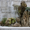 山水盆景是以觀賞巖石為主的一類盆景。制作山水盆景,首先必須進行藝術構思,確定主題,然后按照山石的天然氣質,取其全部或局部適宜造型的石料,并以植物及必要配件進行人工雕琢,配置成假山。將奇峰異巒、高峽飛漾、百嶂千峰、洞幽奇景等自然景色,濃縮到淺盆中,盛在幾案上,儼如一幅立體山水畫,使人如臨碧波綠水之前、名山大川之間,意趣盎然。 分類 水盆型把山石置于淺口水盆中,盆中盛水不盛土. 旱盆型淺盆中有山石而不放水,植物及配件點綴在山石上,但需要保持濕潤. 水旱型淺盆中一部分是土壤、山石、樹木、而另一部分是水。 石料的選擇 制作山水盆景的基本材料主要是山石。我國地大物博,山石的種類繁多,常用的山石約有三十多種,基本上可分為松質和硬質兩大類。松質的吸水性好,容易加工雕琢造型;硬質的則質地堅硬而不吸水,不易加工。不管松質或硬質山石,制作山水盆景的石料必須具有天然紋理、色彩以及形態自然等特點。 (1)砂積石 砂積石呈灰褐色或土黃色,因產地不同,不但色澤有深淺之分,而且質地的松硬程度也有差別。一般來講,砂質石質輕而松,可根據需要,隨心所欲地雕出各種形態的峰、洞、巖以及紋理等,還因其吸水性好,栽種植物易于生長,因此,這種松質石是制作山水盆景最常用的石料之一。但這種石料也有缺點,日子久了容易風化。這種石多產于浙江、安徽、四川、河北、山東等地。 (2)蘆管石 (也稱麥稈石) 蘆管石同砂積石的質地、顏色及產地基本相同。蘆管石有粗有細,有天然形成的管狀小孔和奇峰異洞。選取該石時,應取其自然、完整的部分,稍為加工便可成型。但加工時要特別小心,否則蘆管斷裂便影響自然美。 (3)浮石 浮石是玄武巖的一種,由火山噴發的巖漿冷凝而成,顏色有灰、灰黃、灰白等色,質地疏松,內部有較均勻的小孔,能浮于水面,吸水性好,用小刀可隨意雕刻出各種形態。此石產于東北的吉林長白山以及黑龍江等地。 (4)海母石 海母石是一種貝殼類的沖積化石,因多產于海水中,含有較多的鹽份,需要用清水浸洗一段較長的時間,去其鹽份,才可附植小草木。該石質地疏松,便于改造,吸水性也好。這種石多產于海濱。 (5)鐘乳石 鐘乳石多產于廣東、廣西等各地巖洞,多為白色或微黃色,經過長期自然巖溶而形成柱狀、錐狀等各種形狀,質地較疏松,鋸截較方便。 (6)英石 英石盛產于廣東英德一帶。據《韶州府志》描述:“英石如芙蓉亂削,乳竇交通,p54巖勾漏,無不奇巧玲瓏”。其顏色以灰黑色為多,間有白色、淺綠色和帶白紋理的雜色。有天然形成的正背石,背石較平坦,正面紋理自然,富于變化。質地堅硬,不吸水,不易破碎,但加工較困難。在選擇英石時,以崢嶸、多孔、嶙峋,天然形成的為最佳。 (7)靈壁石 靈壁石質地堅硬,叩之有金屬聲,有黑色、白色,其中也夾雜有黑、白、赭、綠等色,俗稱五彩,多產于安徽省的靈壁縣。 (8)蠟石 蠟石無整體的巖層,多以獨石存于山中。在我國南方各式各地高溫多濕的山坑里,經常被水沖擊,形成各種形態,質地堅硬,不能加工造型,只能以獨石擺設。色有深黃、淺黃、白等。全石以無損壞、無雜質、表面滑凈而有光澤及以竇穴奇形怪狀的為珍品。 (9)斧劈石 斧劈石質硬而脆,顏色有多種,有深灰、淺灰、灰黑色和土黃色等。這種石具有絲狀或片狀的紋理。順其紋理,略施斧鑿或鋸截,加工整形,可表現懸崖峭壁或高聳入云、雄偉挺拔的山峰。此石產于江蘇一帶。 (10)木化石 木化石即古代樹木的化石,質地堅硬,加工較困難。顏色有黃褐色和深灰色。它是制作石山盆景的良好石料。 除上述常用的石料外,還有其他巖石,如產于廣東花縣的菊花石、芙蓉石,肇慶的端石和白星巖石,浙江的松皮石、石筍,四川的龜紋石、雞骨石等等,也可作山水盆景的材料。 石山的布局 山水盆景是運用移天縮地、以小見大的藝術手法,根據“一峰則太華千尋,一勺則江湖萬里”的原則來造型和布局的。山水盆景以山為主,成功的石山必須是既具形態美和雄偉的山勢,又有皺、瘦、透、漏之妙。“皺”就是要求石上表面有紋理,皺褶得有規律,不宜平滑;“瘦”就是要求石塊稍長,頂端較寬有棱角,不宜臃腫;“透”就是指石塊里面有大小孔道,互相溝通;“漏”是指石料要有孔隙,能夠通氣排水。我們在選擇石料制作盆景時,主要是要根據石的特點來確定主題。如修直挺拔、呈懸崖峭壁的,可用來制作險峰;呈扁長形狀的,可用來表現連綿不斷的山巒;皺、瘦、透、漏皆備的,不但可作云峰、洲島、土山,還可作獨石欣賞。如何充分利用石的自然形態進行布局、組拼安排,有下面三種方法可供參考。 ①獨石。獨石俗稱孤峰,在盆內的左邊或右邊安置一塊較大的石峰,另一側放置一兩塊小石作島嶼,這樣大山、小島大小懸殊,各在其位,形成一峰異起于遼闊水面上的景致,此景蘊含深遠,主題集中。這種石料以不用人工加工而自然形成的獨石為佳。 ②子母石。在盆內設置兩塊一大一小的石峰,左右對峙,母石(主峰)突出,略偏于盆的任意一方,但不能立于盆的中央,這樣母石在主位,子石作陪襯,子、母石高矮不一,大小各異,賓主分明。兩石隔水相望,遙相呼應,既對立又統一,既簡練又符合天然山水的真實性。 ③群石。這種石山狀如“眾如拱伏,主山始尊”。盆內山幾座較大的石山組成,群石中的主山必須擺設在重要的位置上,其