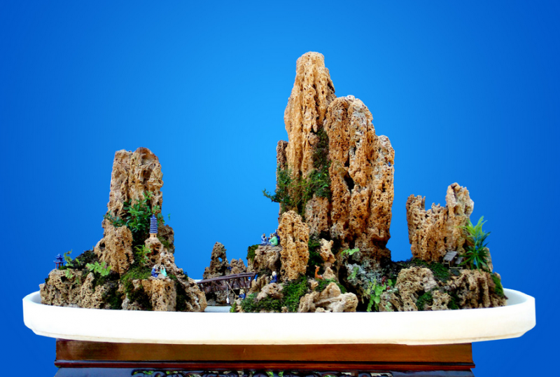 山水盆景是以觀賞巖石為主的一類盆景。制作山水盆景,首先必須進行藝術構思,確定主題,然后按照山石的天然氣質,取其全部或局部適宜造型的石料,并以植物及必要配件進行人工雕琢,配置成假山。將奇峰異巒、高峽飛漾、百嶂千峰、洞幽奇景等自然景色,濃縮到淺盆中,盛在幾案上,儼如一幅立體山水畫,使人如臨碧波綠水之前、名山大川之間,意趣盎然。 分類 水盆型把山石置于淺口水盆中,盆中盛水不盛土. 旱盆型淺盆中有山石而不放水,植物及配件點綴在山石上,但需要保持濕潤. 水旱型淺盆中一部分是土壤、山石、樹木、而另一部分是水。 石料的選擇 制作山水盆景的基本材料主要是山石。我國地大物博,山石的種類繁多,常用的山石約有三十多種,基本上可分為松質和硬質兩大類。松質的吸水性好,容易加工雕琢造型;硬質的則質地堅硬而不吸水,不易加工。不管松質或硬質山石,制作山水盆景的石料必須具有天然紋理、色彩以及形態自然等特點。 (1)砂積石 砂積石呈灰褐色或土黃色,因產地不同,不但色澤有深淺之分,而且質地的松硬程度也有差別。一般來講,砂質石質輕而松,可根據需要,隨心所欲地雕出各種形態的峰、洞、巖以及紋理等,還因其吸水性好,栽種植物易于生長,因此,這種松質石是制作山水盆景最常用的石料之一。但這種石料也有缺點,日子久了容易風化。這種石多產于浙江、安徽、四川、河北、山東等地。 (2)蘆管石 (也稱麥稈石) 蘆管石同砂積石的質地、顏色及產地基本相同。蘆管石有粗有細,有天然形成的管狀小孔和奇峰異洞。選取該石時,應取其自然、完整的部分,稍為加工便可成型。但加工時要特別小心,否則蘆管斷裂便影響自然美。 (3)浮石 浮石是玄武巖的一種,由火山噴發的巖漿冷凝而成,顏色有灰、灰黃、灰白等色,質地疏松,內部有較均勻的小孔,能浮于水面,吸水性好,用小刀可隨意雕刻出各種形態。此石產于東北的吉林長白山以及黑龍江等地。 (4)海母石 海母石是一種貝殼類的沖積化石,因多產于海水中,含有較多的鹽份,需要用清水浸洗一段較長的時間,去其鹽份,才可附植小草木。該石質地疏松,便于改造,吸水性也好。這種石多產于海濱。 (5)鐘乳石 鐘乳石多產于廣東、廣西等各地巖洞,多為白色或微黃色,經過長期自然巖溶而形成柱狀、錐狀等各種形狀,質地較疏松,鋸截較方便。 (6)英石 英石盛產于廣東英德一帶。據《韶州府志》描述:“英石如芙蓉亂削,乳竇交通,p54巖勾漏,無不奇巧玲瓏”。其顏色以灰黑色為多,間有白色、淺綠色和帶白紋理的雜色。有天然形成的正背石,背石較平坦,正面紋理自然,富于變化。質地堅硬,不吸水,不易破碎,但加工較困難。在選擇英石時,以崢嶸、多孔、嶙峋,天然形成的為最佳。 (7)靈壁石 靈壁石質地堅硬,叩之有金屬聲,有黑色、白色,其中也夾雜有黑、白、赭、綠等色,俗稱五彩,多產于安徽省的靈壁縣。 (8)蠟石 蠟石無整體的巖層,多以獨石存于山中。在我國南方各式各地高溫多濕的山坑里,經常被水沖擊,形成各種形態,質地堅硬,不能加工造型,只能以獨石擺設。色有深黃、淺黃、白等。全石以無損壞、無雜質、表面滑凈而有光澤及以竇穴奇形怪狀的為珍品。 (9)斧劈石 斧劈石質硬而脆,顏色有多種,有深灰、淺灰、灰黑色和土黃色等。這種石具有絲狀或片狀的紋理。順其紋理,略施斧鑿或鋸截,加工整形,可表現懸崖峭壁或高聳入云、雄偉挺拔的山峰。此石產于江蘇一帶。 (10)木化石 木化石即古代樹木的化石,質地堅硬,加工較困難。顏色有黃褐色和深灰色。它是制作石山盆景的良好石料。 除上述常用的石料外,還有其他巖石,如產于廣東花縣的菊花石、芙蓉石,肇慶的端石和白星巖石,浙江的松皮石、石筍,四川的龜紋石、雞骨石等等,也可作山水盆景的材料。 石山的布局 山水盆景是運用移天縮地、以小見大的藝術手法,根據“一峰則太華千尋,一勺則江湖萬里”的原則來造型和布局的。山水盆景以山為主,成功的石山必須是既具形態美和雄偉的山勢,又有皺、瘦、透、漏之妙。“皺”就是要求石上表面有紋理,皺褶得有規律,不宜平滑;“瘦”就是要求石塊稍長,頂端較寬有棱角,不宜臃腫;“透”就是指石塊里面有大小孔道,互相溝通;“漏”是指石料要有孔隙,能夠通氣排水。我們在選擇石料制作盆景時,主要是要根據石的特點來確定主題。如修直挺拔、呈懸崖峭壁的,可用來制作險峰;呈扁長形狀的,可用來表現連綿不斷的山巒;皺、瘦、透、漏皆備的,不但可作云峰、洲島、土山,還可作獨石欣賞。如何充分利用石的自然形態進行布局、組拼安排,有下面三種方法可供參考。 ①獨石。獨石俗稱孤峰,在盆內的左邊或右邊安置一塊較大的石峰,另一側放置一兩塊小石作島嶼,這樣大山、小島大小懸殊,各在其位,形成一峰異起于遼闊水面上的景致,此景蘊含深遠,主題集中。這種石料以不用人工加工而自然形成的獨石為佳。 ②子母石。在盆內設置兩塊一大一小的石峰,左右對峙,母石(主峰)突出,略偏于盆的任意一方,但不能立于盆的中央,這樣母石在主位,子石作陪襯,子、母石高矮不一,大小各異,賓主分明。兩石隔水相望,遙相呼應,既對立又統一,既簡練又符合天然山水的真實性。 ③群石。這種石山狀如“眾如拱伏,主山始尊”。盆內山幾座較大的石山組成,群石中的主山必須擺設在重要的位置上,其